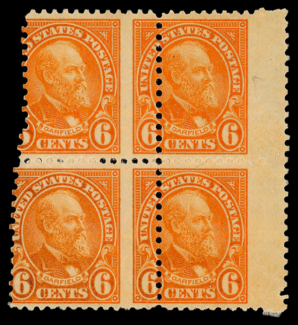 5394 nhbl 558 var. image1922, 6¢ Garfield, pre-perforating fold-over (Scott 558 var.), block of 4, fold-over created two irregular misperfs; vivid colors sand crisp graphics, o.g., never hinged, Fine to Very Fine. (Image) Suggested Bid $120