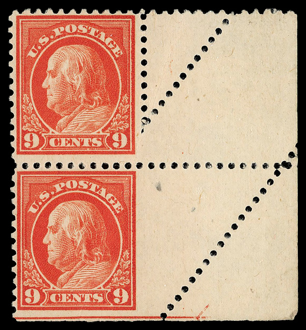 5383 nh 509 var. image1917, 9¢ salmon red, perf. 11, pre-perforating fold-over (Scott 509 var.), bottom right pair, fold-over caused "crazy perfs"; bright color on clean white paper, o.g., never hinged (gum disturbances), Fine to Very Fine. (Image) Suggested Bid $80