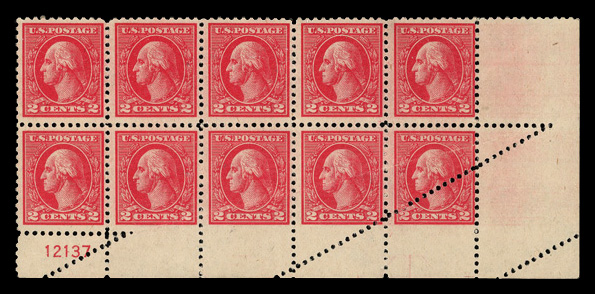 5390 nhbl 528 var. image1918, 2¢ carmine, type Va, offset printing, pre-perforating fold-over (Scott 528 var.), bottom right plate block of 10, fold-over resulting in "diagonal crazy perfs"; plate number 12137; bright color and crisp details, o.g., never hinged (natural gum creases), Very Fine. (Image) Suggested Bid $160