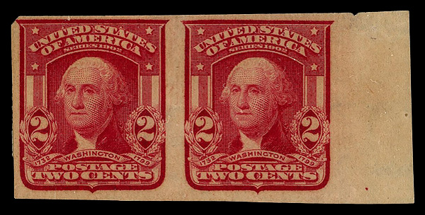 5372 og 320 var. image1906, 2¢ carmine, type I, imperf., pre-perforating fold-over (Scott 320 var.), pair, sharp lines with vivid bright color, o.g., hinged; upper left corner cut, small hole on upper right edge, Fine. (Image) Suggested Bid $24