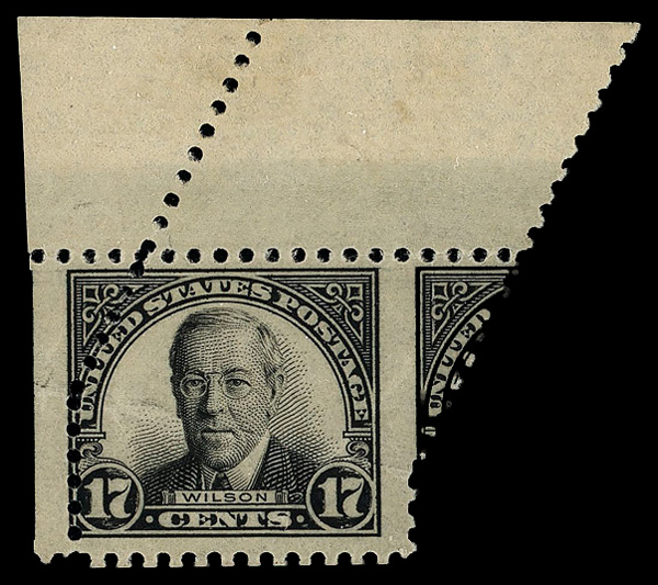 5399 og 623 var. image1925, 17¢ Wilson, pre-perforating fold-over (Scott 623 var.), top margin single, foldover created "diagonal crazy perfs", strong color and sharp detail, o.g. (gum disturbances), Fine to Very Fine. (Image) Suggested Bid $60
