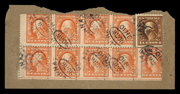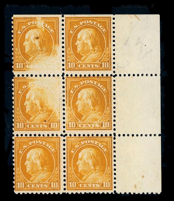 5386 ogbl 510 var. image1917, 10¢ orange yellow, perf. 11, foreign contamination (Scott 510 var.), right margin block of 6, un-printed area on the left upper two stamps likely caused by foreign contamination on the plate, o.g., hinged, Fine to Very Fine. (Image) Suggested Bid $100