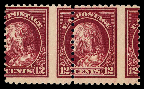 5388 nh 512 var. image1917, 12¢ claret brown, perf. 11, misperforation (Scott 512 var.), pair, deep color on clean paper with a vertical misperforation through the center of the example, o.g., never hinged, Very Fine. (Image) Suggested Bid $48