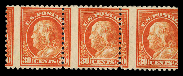 5389 og 516 var. image1917, 30¢ orange red, perf. 11, misperforation (Scott 516 var.), horizontal strip of 3, visually appealing example with vertical misperforations, o.g., hinged, Very Fine. (Image) Suggested Bid $120