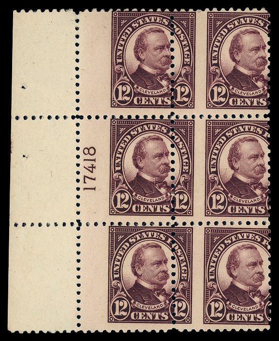 5395 ogbl 564 var. image1923, 12¢ Grover Cleveland, misperforation (Scott 564 var.), left margin plate block of 6, interesting example with strong color and vertical misperforation that caused plate number 17418 to be on the right side of the perfs, Fine to Very Fine. (Image) Suggested Bid $280