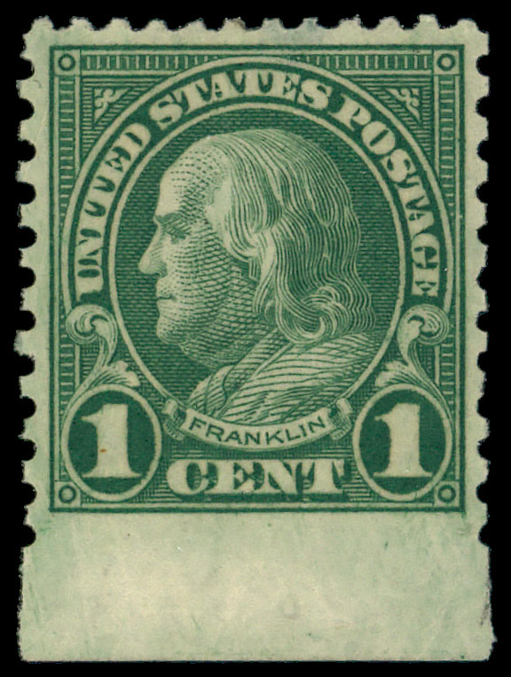 5397 og 578 var. image1923, 1¢ Franklin, rotary press coil waste, perf. 11 x 10, imperforate bottom margin (Scott 578 var.), single, intriguing example with no bottom perforations, o.g., hinged; possible thin from hinge removal, Very Fine. (Image) Suggested Bid $40