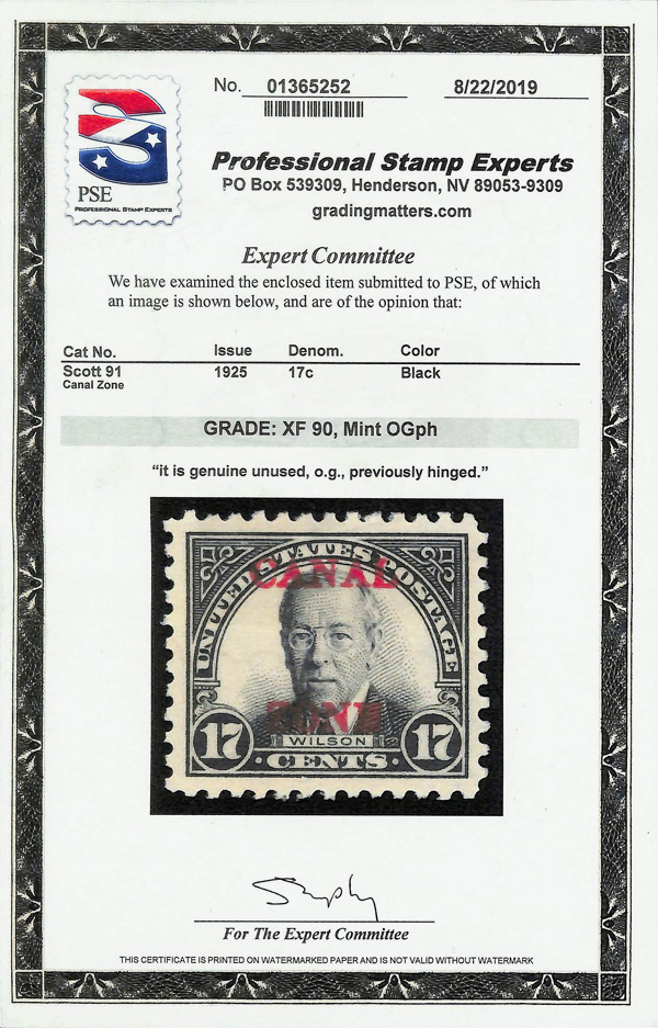 5468 og 91 image1926, 17¢ Wilson, sharp "A" (Scott 91), o.g., very lightly hinged, Post Office fresh and sound, Extremely Fine, with 2019 P.S.E. certificate graded XF 90.