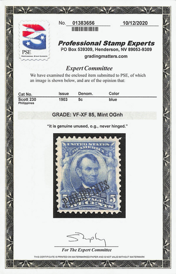 5476 nh 230 image1904, 5¢ blue (Scott 230), o.g., never hinged, sound with crisp detail and bright paper, Very Fine to Extremely Fine, with 2020 P.S.E. certificate graded VF-XF 85.