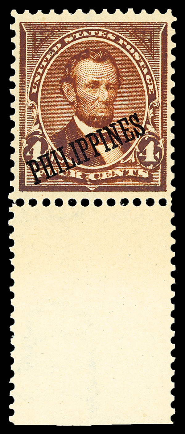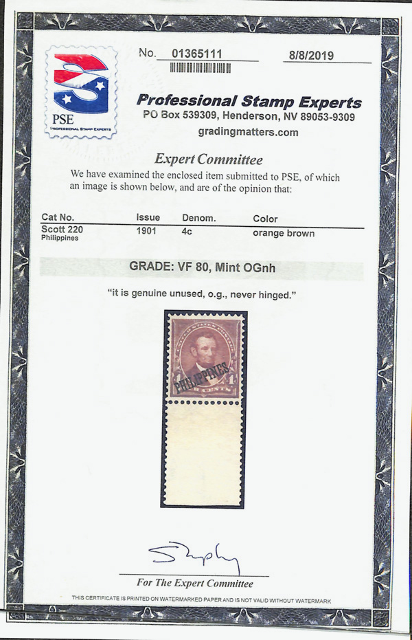 5475 nh 220 image1901, 4¢ orange brown (Scott 220), full wide bottom margin single, o.g., never hinged, immaculate and sound in deep color with gargantuan selvage tab, Very Fine, with 2019 P.S.E. certificate graded VF 80.