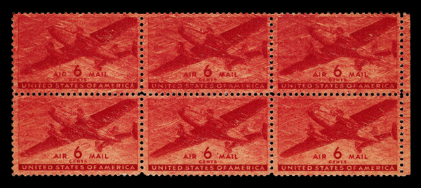5443 nhbl C25 var. imageAirmail, 1941, 6¢ Transport, heavily over inked (Scott C25 var.), margin block of 6, dramatic example of an over inked and smeared plate which transitions from a darker stamp at the upper left to the lighter stamp at the bottom right, o.g., never hinged (natural gum wrinkles), Very Fine to Extremely Fine. (Image) Suggested Bid $48