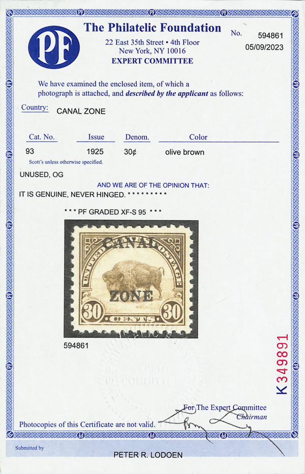 5469 nh 93 image1926, 30¢ American Buffalo, sharp "A" (Scott 93), centered beautifully within margins, the SMQ doesn't currently list this issue, o.g., never hinged, Extremely Fine to Superb, with 2023 P.F. certificate graded XF-SUP 95.