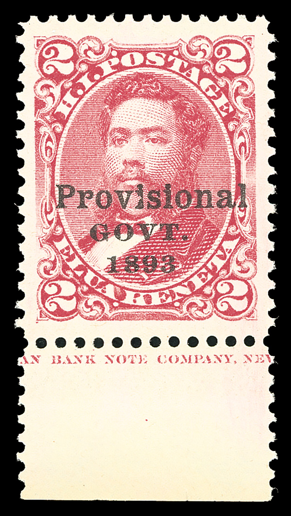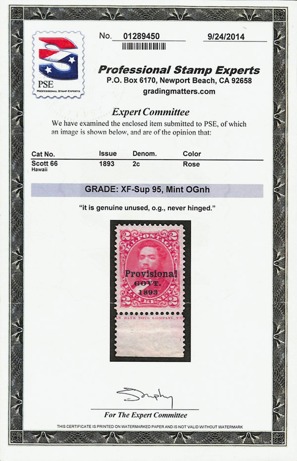 5473 nh 66 image1893, Provisional Govt., 2¢ rose, black overprint (Scott 66), handsome framing, brilliant surface tone, the SMQ doesn't currently list this issue, o.g., never hinged, Extremely Fine to Superb, with 2014 P.S.E. certificate graded XF-SUP 95.