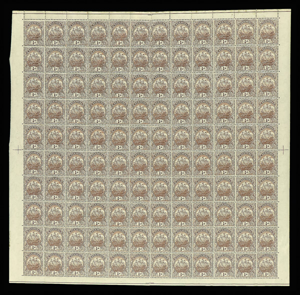 5527 nhbl 40 image1912, Caravel, ¼d brown (Scott 40), complete sheet of 240, o.g., never hinged, Post Office fresh and remarkably intact; center vertical perforations folded, position 120 with a small corner crease, Very Fine, with 2019 P.S.E. certificate.