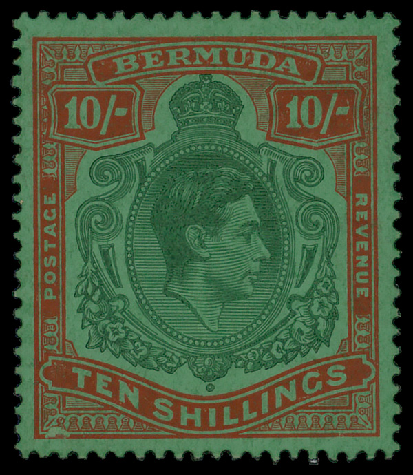 5529 og 126b image1939, King George VI, 10s bluish green & deep red on green, perf. 14, chalky paper (Scott 126b), single, o.g., lightly hinged, Fine to Very Fine.