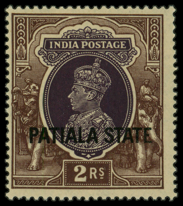 5558 nh 93 image1938, King Geiorge VI 2r dark brown & dark violet overprinted Patiala State (Scott 93), single, o.g., never hinged, Fine to Very Fine.