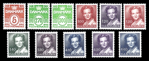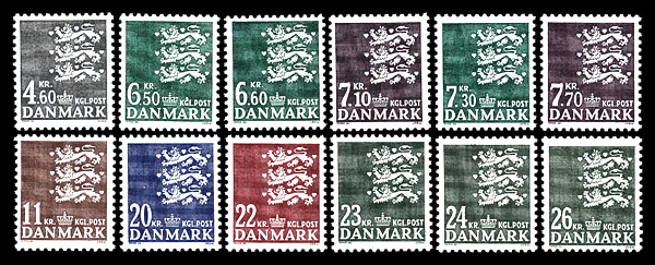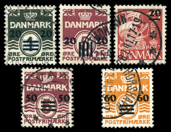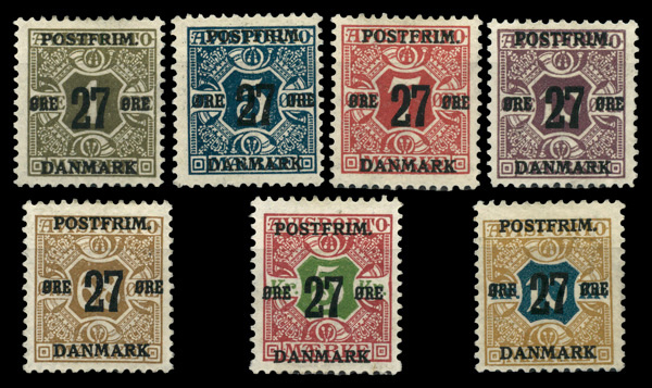 5729 og 138-144 image1918, Surcharged Newspaper Stamps, 27øre on 1ø to 1kr complete, New Crown watermark (Scott 138-144), set of 7, complete set of singles, o.g., hinged, Fine to Very Fine.