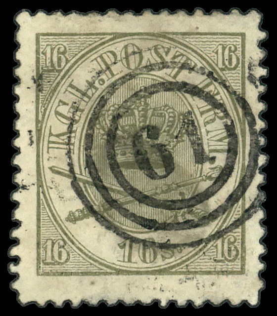 5724 O 15 image1864, Royal Emblems in Large Oval, 16sk olive green, perf. 13 x 12½ (Scott 15), single, Fine to Very Fine.