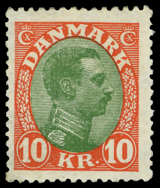 5727 og 131 image1928, King Christian X, 10kr vermilion & yellow green (Scott 131), single, o.g., hinged, Fine to Very Fine.