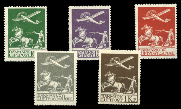 5732 C1-C5 image1925-29, 10o-1k Airplane & Plowman, complete (Scott C1-C5), set of 5, o.g., hinge remnants (25o crease), Very Fine.