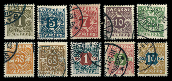 5742 O P1-P10 imageNewspaper Stamps, 1907, 1øre to 10kr complete (Scott P1-P10), set of 10, complete set of singles, Fine to Very Fine.