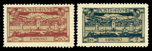 5752 nh E12-E13 image1923, Fiume in 16th Century 60c rose & buff and 2l dark blue& buff complete (Scott E12-E13), complete set of singles, o.g., never hinged, Fine to Very Fine.