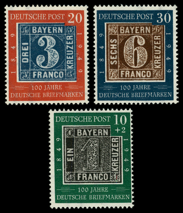 5876 667-668 & B309 image1949, German Postage Stamp Centenary (Scott 667-668 & B309), o.g., never hinged, Very Fine to Extremely Fine.