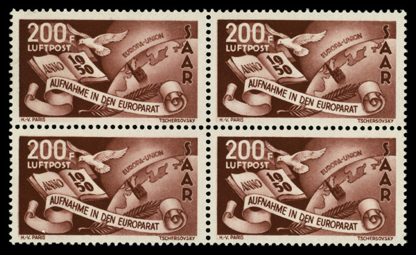 5857 nhbl C12 imageAirmail, 1950, 200fr Admission to the Council of Europe (Scott C12), block of 4, o.g., never hinged, Very Fine to Extremely Fine.
