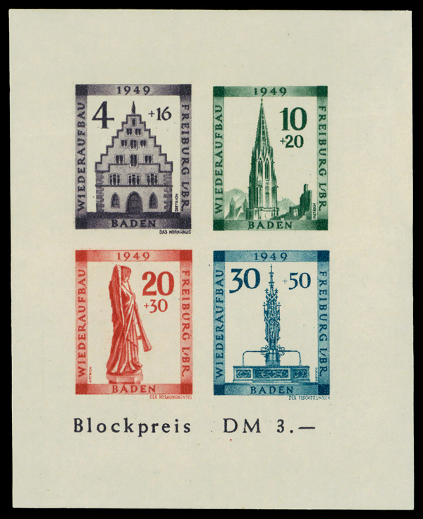 5859 nhbl 5NB8b image1949, Freiburg Reconstruction souvenir sheet of 4, imperf. (Scott 5NB8b), complete set of miniature sheet of 4, o.g., never hinged, Fine to Very Fine.