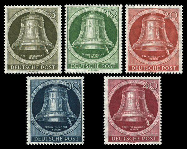 5873 9N75-9N79 image1951-52, 5pf-40pf Freedom Bell, 1st re-engraved, complete (Scott 9N75-9N79), set of 5, o.g., never hinged, Fine to Very Fine.