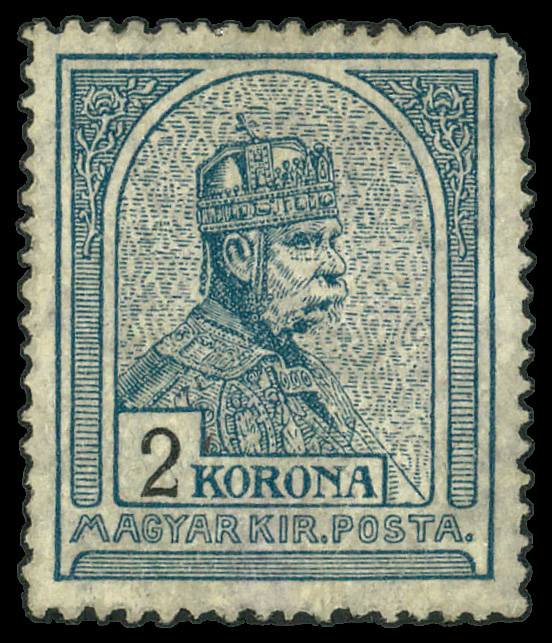 5921 og 102a image1913-1916, Franz Josep I Wearing Hungarian Crown, 2k dull blue (Scott 102a), single, o.g., hinged, Fine to Very Fine.