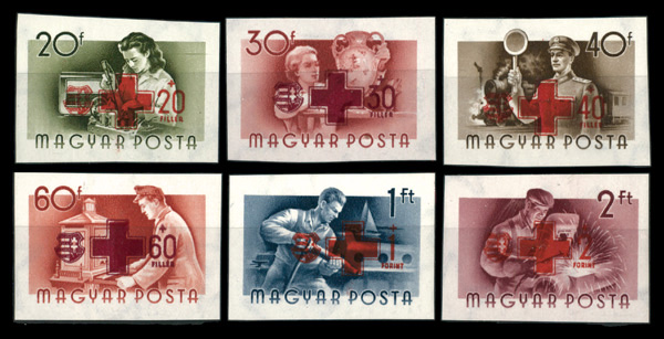 5930 nh B211-B216 image1957, Hungarian Red Cross, complete imperf singles (Scott B211-B216), o.g., never hinged, Fine to Very Fine.