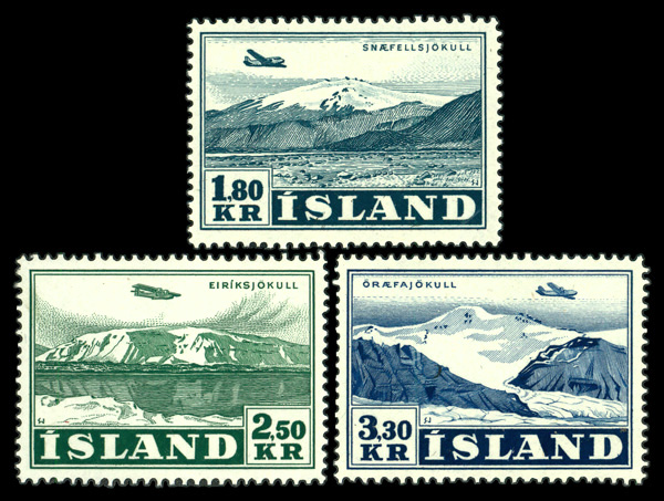 5962 nh C27-C29 imageAirmail, 1952 Glacier complete (Scott C27-C29), set of 3, complete set of single, o.g., never hinged, Fine to Very Fine.
