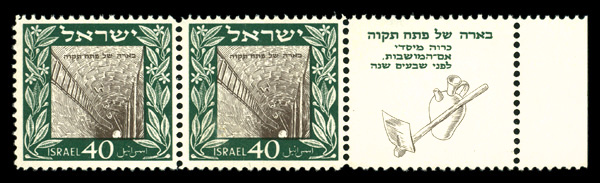 5983 nh 27 image1949, 40p Petah Tikva (Scott 27), pair with tab, o.g., never hinged, Fine to Very Fine.