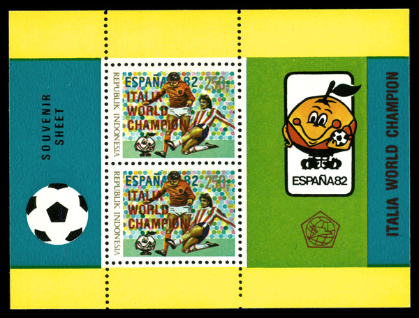 5973 nhbl 1177c image1982, World Cup, 250r overprinted in red " Italia World Champion" (Scott 1177c), souvenir sheet of 2, o.g., never hinged, Fine to Very Fine.