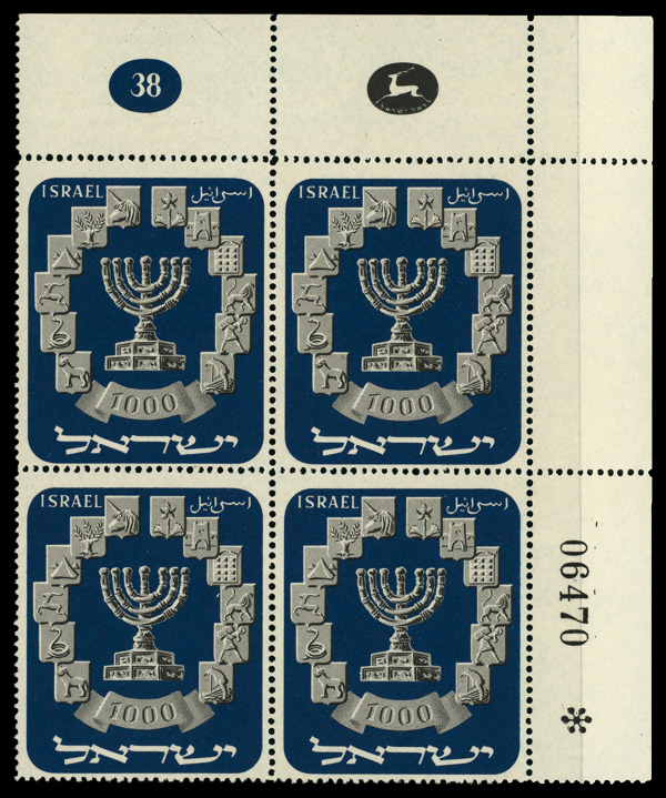 5985 nhbl 55 image1952, 1000p Menorah (Scott 55), plate block of 4, o.g., never hinged, Very Fine.