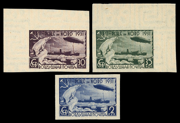 6118 nh C26-C27,C29 imageAirmail, 1931, Polar Flight Zeppelins, imperf (Scott C26-C27,C29), singles, o.g., never hinged, Extremely Fine to Superb.