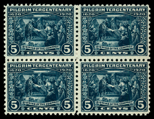 5112 nhbl 550 image1920, 5¢ Pilgrim (Scott 550), block of 4, o.g., never hinged, Fine to Very Fine.