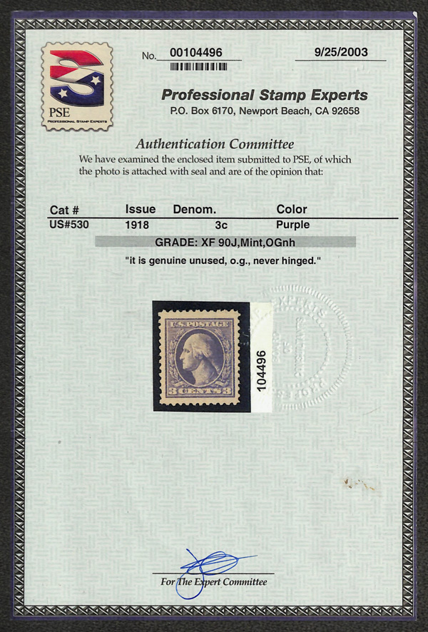5108 nh 530 image1918, 3¢ purple, type IV, offset printing (Scott 530), boldly defined with extra-wide margins, o.g., never hinged, Extremely Fine, with 2003 P.S.E. certificate graded XF 90J.