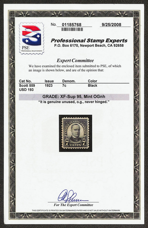 5116 nh 559 image1923, 7¢ McKinley (Scott 559), gorgeous, strong impression, o.g., never hinged, Extremely Fine to Superb, with 2008 P.S.E. certificate graded XF-SUP 95.