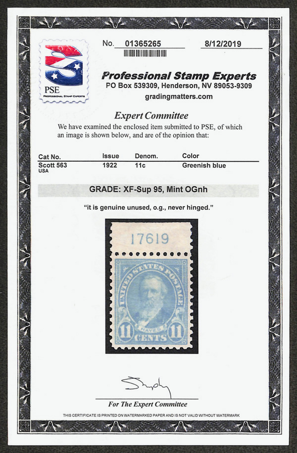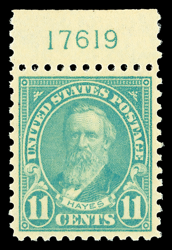 5120 nh 563 image1922, 11¢ Hayes (Scott 563), single with plate number, striking jewel-like luster, o.g., never hinged, Extremely Fine to Superb, with 2019 P.S.E. certificate graded XF-SUP 95.
