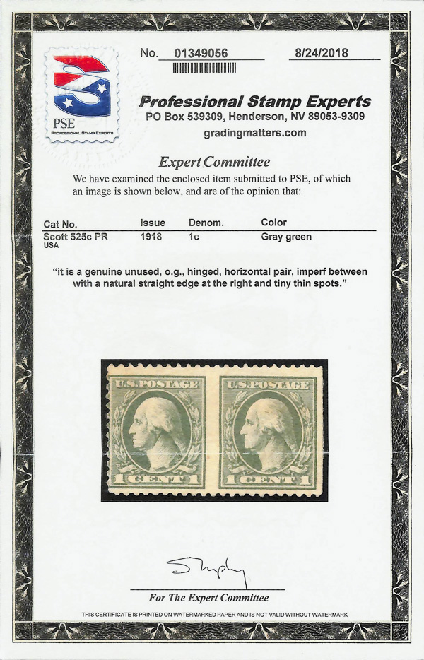 5103 og 525c image1918, 1¢ gray green, offset printing, horizontal pair, imperf. between (Scott 525c), o.g., hinged, fresh-faced with clean detail; natural straight edge at right, tiny thin spots, Very Good to Fine, with 2018 P.S.E. certificate.