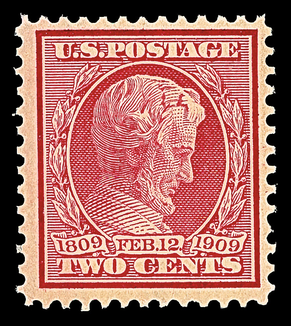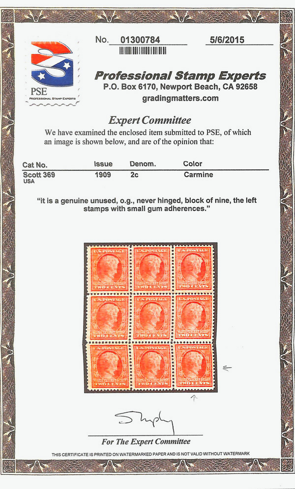5081 nh 369 image1909, 2¢ Lincoln Centenary, bluish paper (Scott 369), o.g., never hinged, attractive example with sharp detail in solid color, Fine to Very Fine, with photocopy of 2015 P.S.E. certificate for block of nine, this position 9.