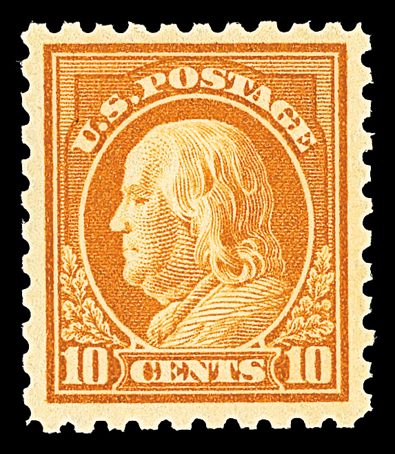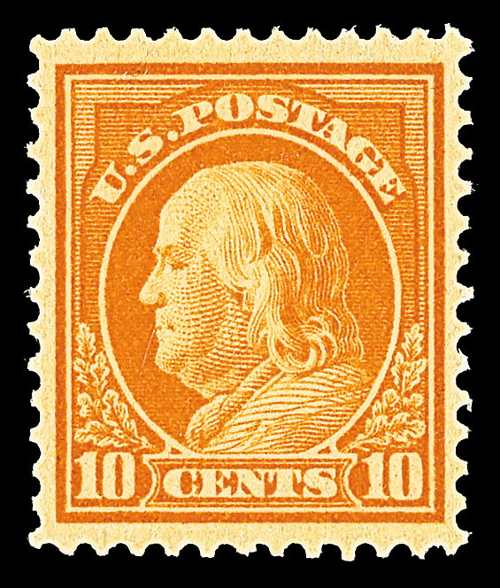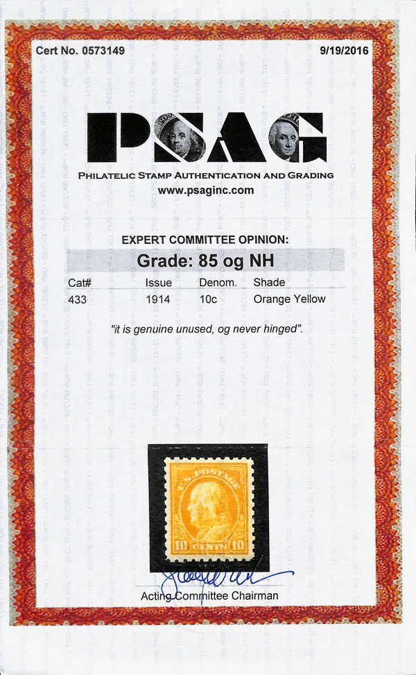 5096 nh 433 image1914, 10¢ orange yellow, S.L. watermark, perf. 10 (Scott 433), o.g., never hinged, Post Office fresh with bright color on matching paper, sound with superior centering, Very Fine to Extremely Fine, with 2016 P.S.A.G. certificate graded VF-XF 85.