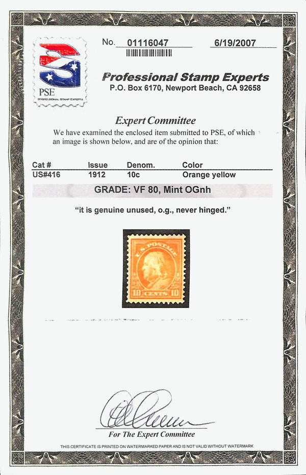 5094 nh 416 image1912, 10¢ orange yellow, S.L. watermark, perf. 12 (Scott 416), o.g., never hinged, Post Office fresh with radiant, deep color fresh as the day it was printed, Very Fine, with 2007 P.S.E. certificate graded VF 80.