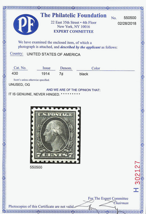 5095 nh 430 image1914, 7¢ black, S.L. watermark, perf. 10 (Scott 430), o.g., never hinged, a lovely stamp with bold color on bright paper, Very Fine, with 2018 P.F. certificate.