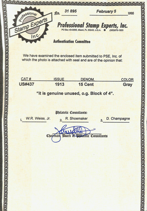 5097 nh 437 image1914, 15¢ gray, S.L. watermark, perf. 10 (Scott 437), o.g., never hinged, fresh and sound with bright color and clear impression, Very Fine, with 1998 P.S.E. certificate for block of four, this position 4.