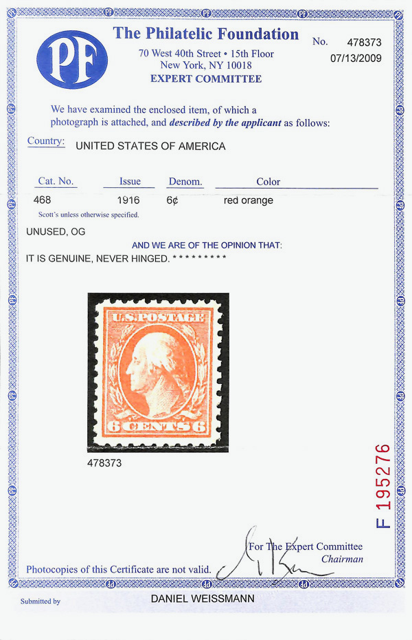 5098 nh 468 image1916, 6¢ red orange, unwatermarked, perf. 10 (Scott 468), o.g., never hinged, wonderfully centered in radiant color, Very Fine, with 2009 P.F. certificate.