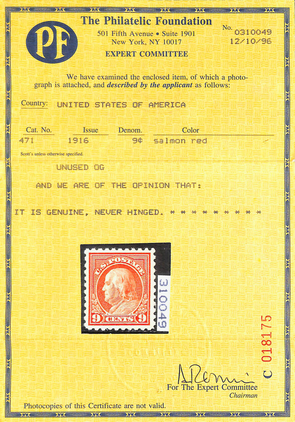5099 nh 471 image1916, 9¢ salmon red, unwatermarked, perf. 10 (Scott 471), o.g., never hinged, Post Office fresh with radiant color and solid centering, bright and sound, Very Fine, with 1996 P.F. certificate.