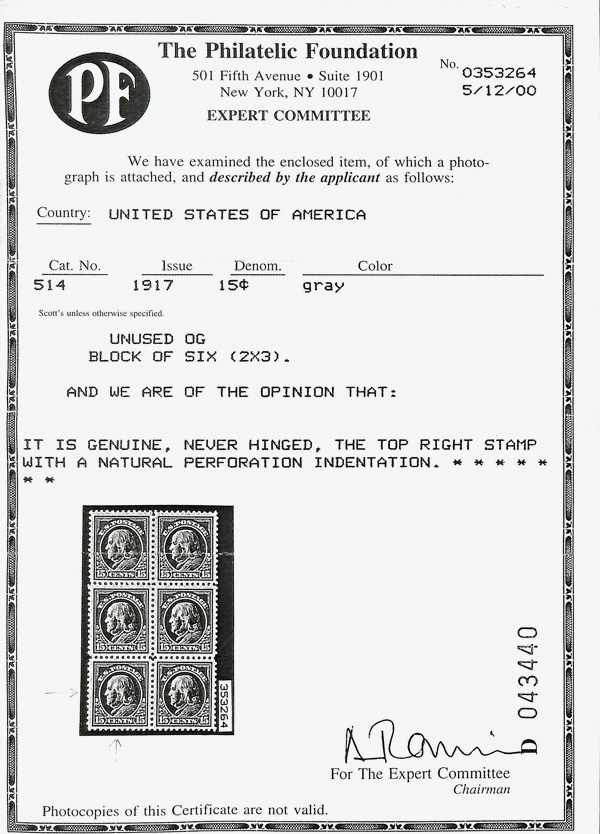 5101 nh 514 image1917, 15¢ gray, perf. 11 (Scott 514), o.g., never hinged, sound with solid color on fresh paper, Very Fine, with photocopy of 2000 P.F. certificate for block of six, this position 5.