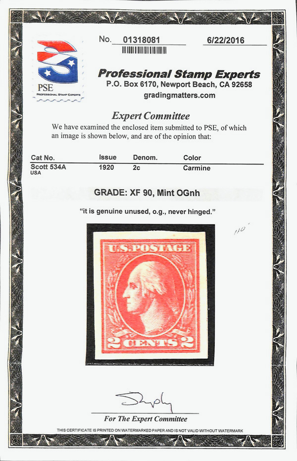 5110 nh 534A image1918, 2¢ carmine, type VI, offset printing, imperf. (Scott 534A), o.g., never hinged, in bold color with large, nicely balanced margins, Extremely Fine, with 2016 P.S.E. certificate graded XF 90.